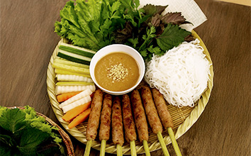 ネムルイは、ひき肉でつくったタネをレモングラスの茎に刺して炭火で焼いた料理。見た目は「焼き鳥のつくね」に似ています。食べるときは茎から外し、野菜と一緒にライスペーパーに巻くことが多いです。一般家庭でもつくられ、飲食店でも定番メニューとして売られています。