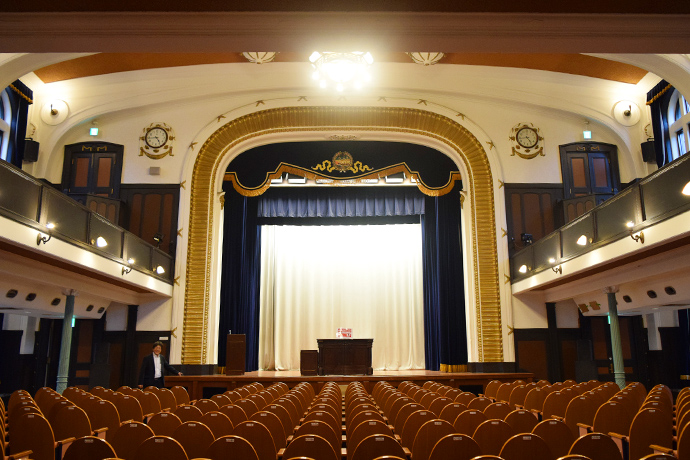 300名弱を収容できる大きな講堂は、渋沢栄一や大隈重信をはじめ、著名な歴史上の人物も講演を行った由緒正しい場所。その歴史の長さを感じられる空間です。