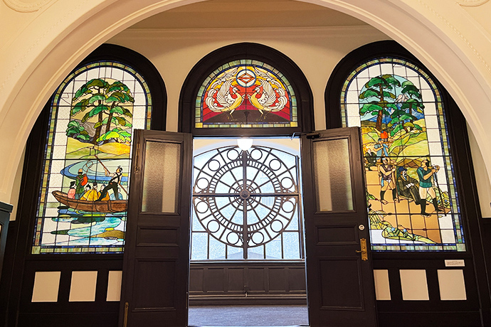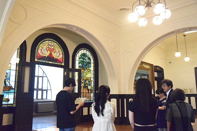 館内ツアーは、2階広間にある国内最大級のステンドグラスからスタート。向かって左が「呉越同舟」、右は「箱根越え」で、開港当時の交通の様子を描いています。