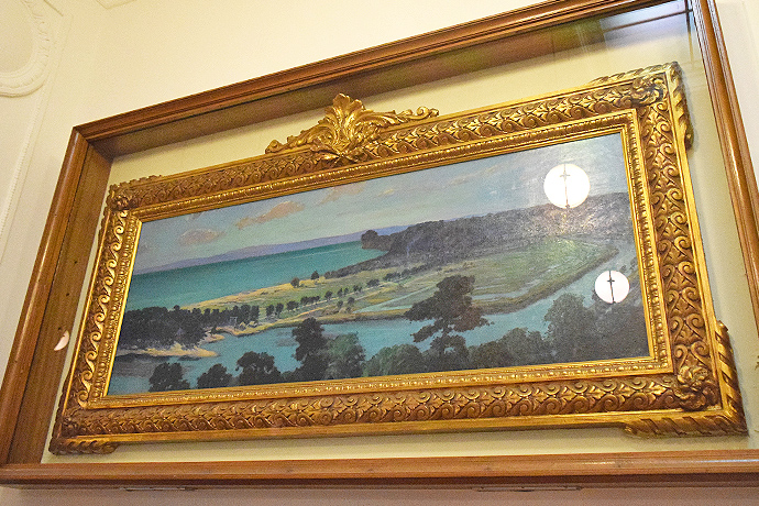 2階広間には、2枚の相対する絵画「開港前の横浜村」も展示されています。関東大震災で消失する前は壁画として制作されていましたが、油絵として復旧されました。