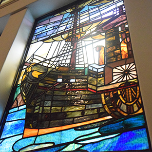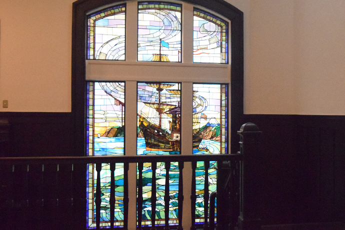 続いて1階と2階をつなぐ階段部分にある「黒船ポーハタン号」のステンドグラスを見学。嘉永7(1854)年に黒船が横浜の港に来航した様子を描いたステンドグラスで、色鮮やかな美しいガラスが、当時の横浜の人々が驚き、感動したであろう壮観な景色を表現しています。
